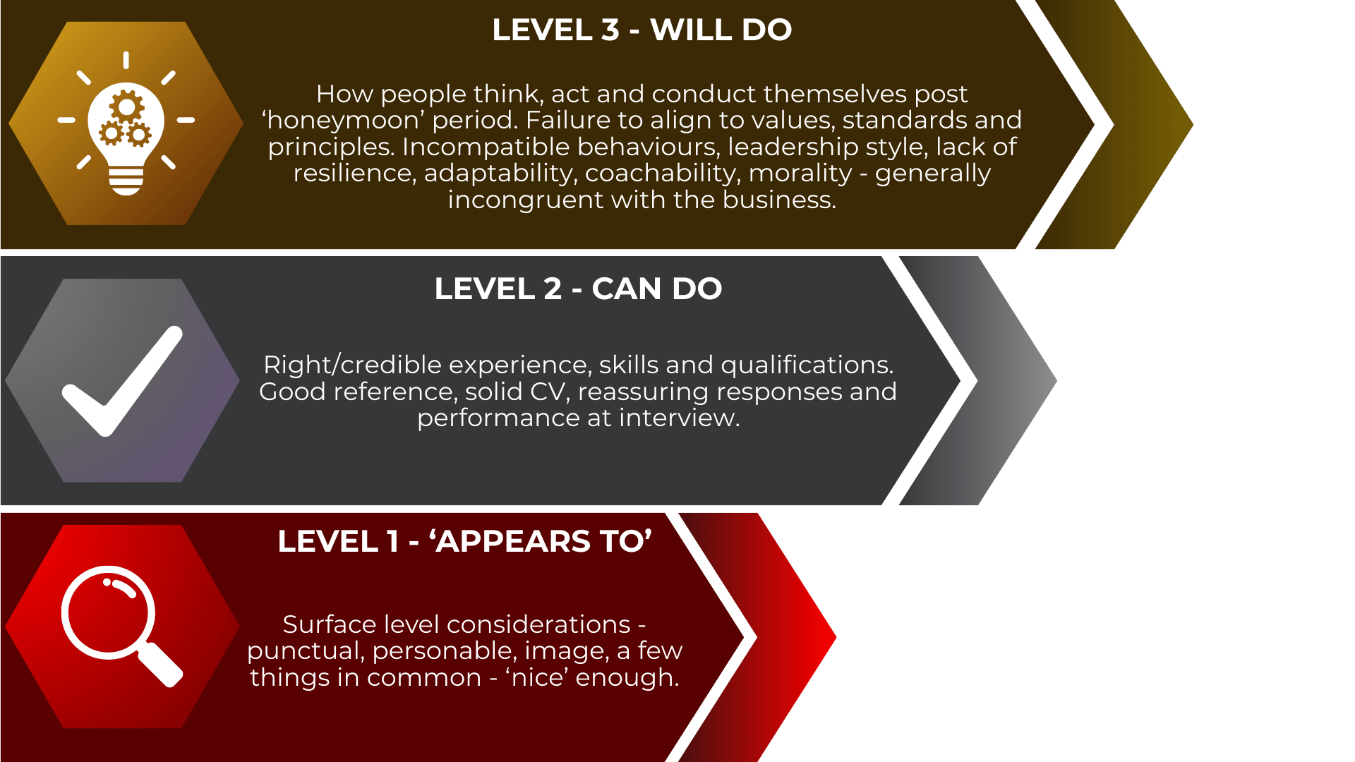 Traditional recruitment focuses heavily on what we call Levels One and Two. Level One is surface-level fit. The person appears right. They are personable, confident and present well. Level Two goes deeper, assessing whether they can do the job through experience, qualifications and interview performance. Most hiring stops here.